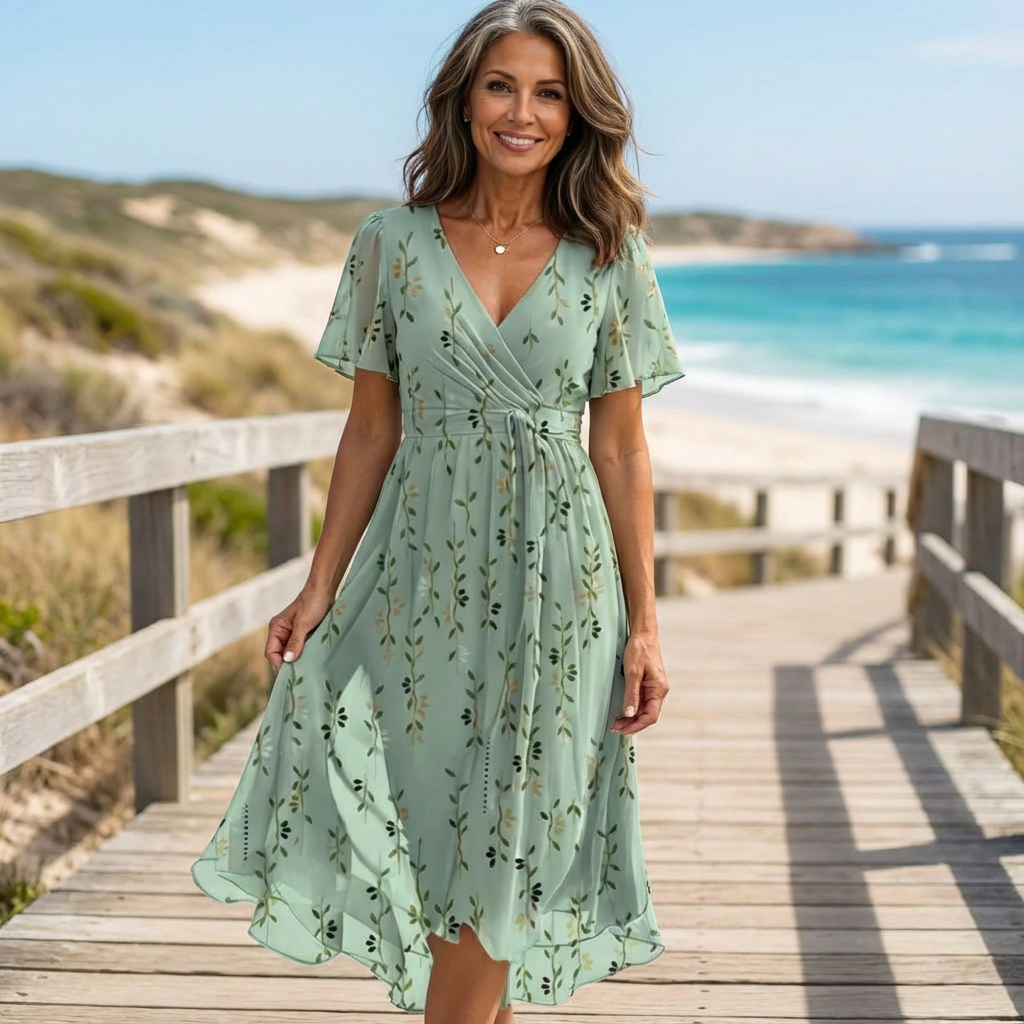 This Amelia Midi Dress captures the essence of lightness and charm with its soft floral print and gracefully flowing silhouette. Featuring a flattering V-neckline, airy flutter sleeves, and thoughtful tummy coverage, it strikes the perfect balance between comfort, sophistication, and support.